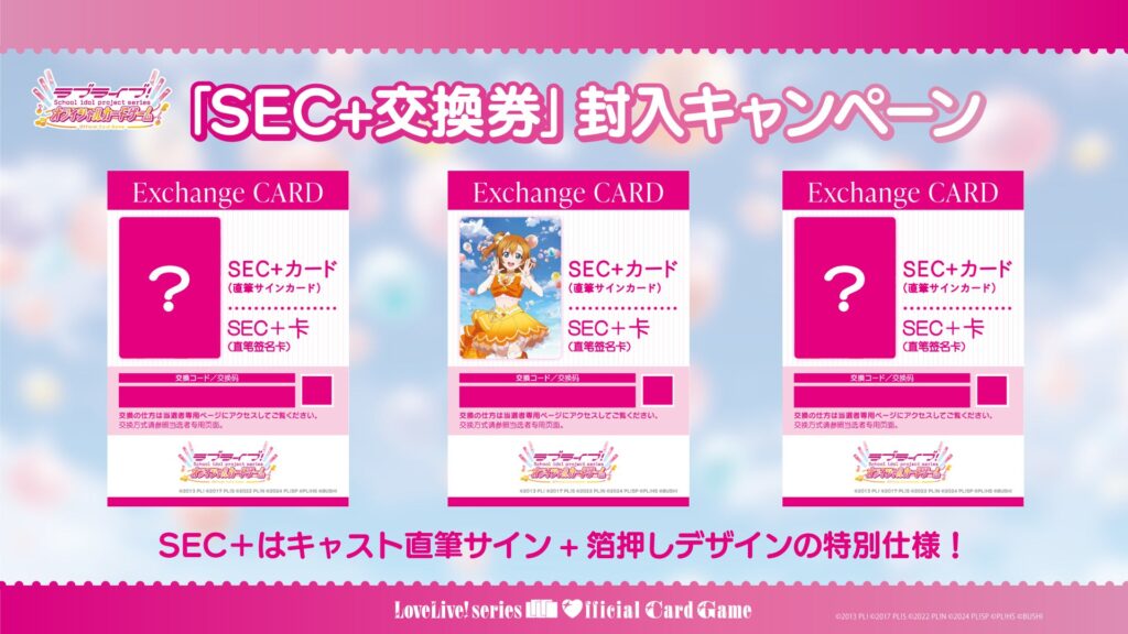 また、8月9日(土)発売の2商品「スタートデッキ ラブライブ!」「ブースターパック 夏、はじまる。」を対象に「SEC+カード交換券」封入キャンペーンを実施。